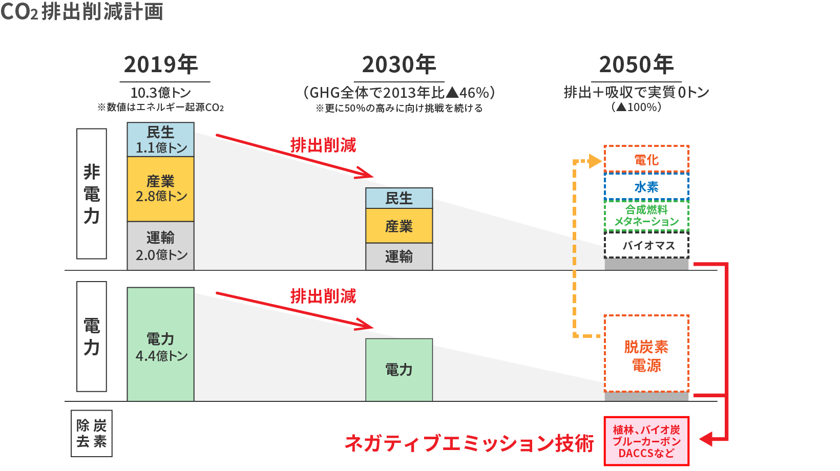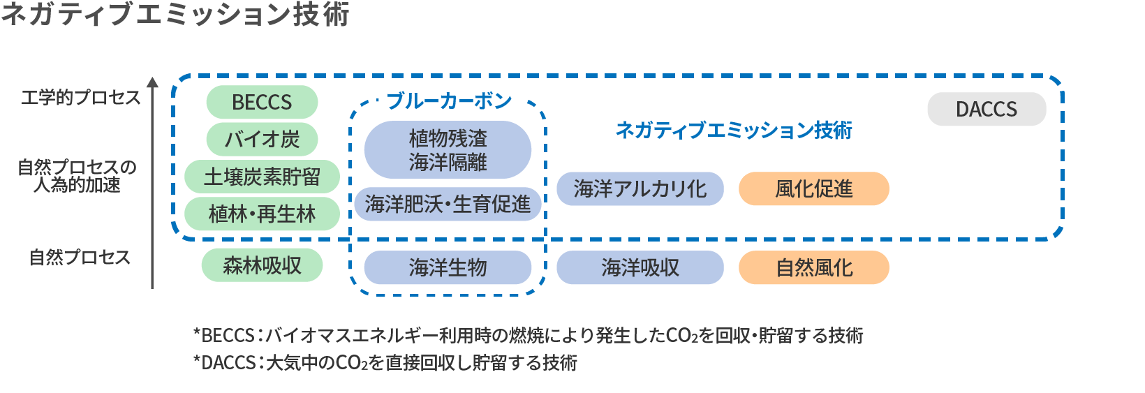 2050年カーボンニュートラルの実現に向けて、各産業では様々な技術開発を進めているところですが、技術的な制約等により完全にCO2の排出をゼロにするのは難しいと考えられています。一方で、自然プロセスや工学的プロセスによってCO2を吸収し、炭素を貯留することができれば、CO2排出量を相殺することができます。このような技術をネガティブエミッション技術といいます。この中でも、自然プロセスの人為的な加速によって、大気中のCO2削減へ寄与していくことが、農地や森林、海洋には期待されています。