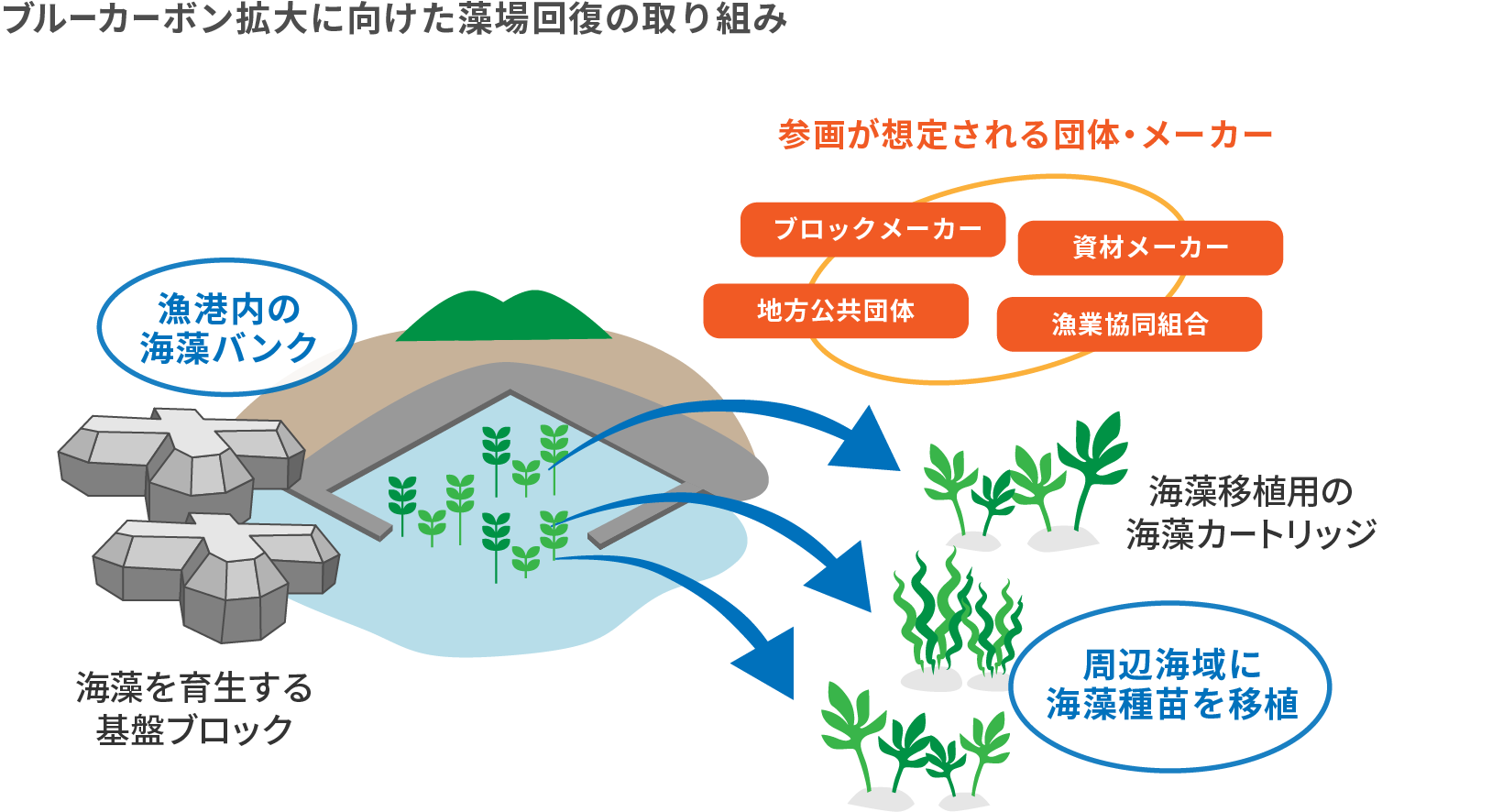 そこで、効果的に藻場を回復させるための方策として、海藻を効率的に生育するための基盤ブロックの開発や、周辺海域に海藻を効率的に移植させるといった「海藻育成システム」の構築を進めていこうとしています。これを海藻バンクとも呼びますが、全国の漁港で使えるような技術開発を目指しています。