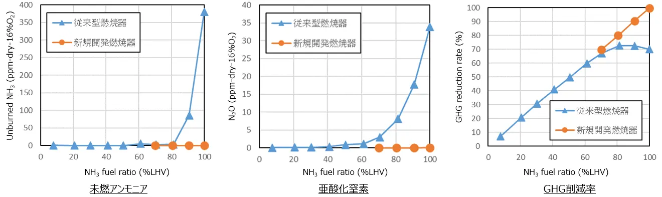 その結果、開発した燃焼器は従来型と比べて、未燃アンモニアとN2Oをほぼゼロに抑制し、アンモニア専焼で温室効果ガス削減99%以上という画期的な性能を達成しました。