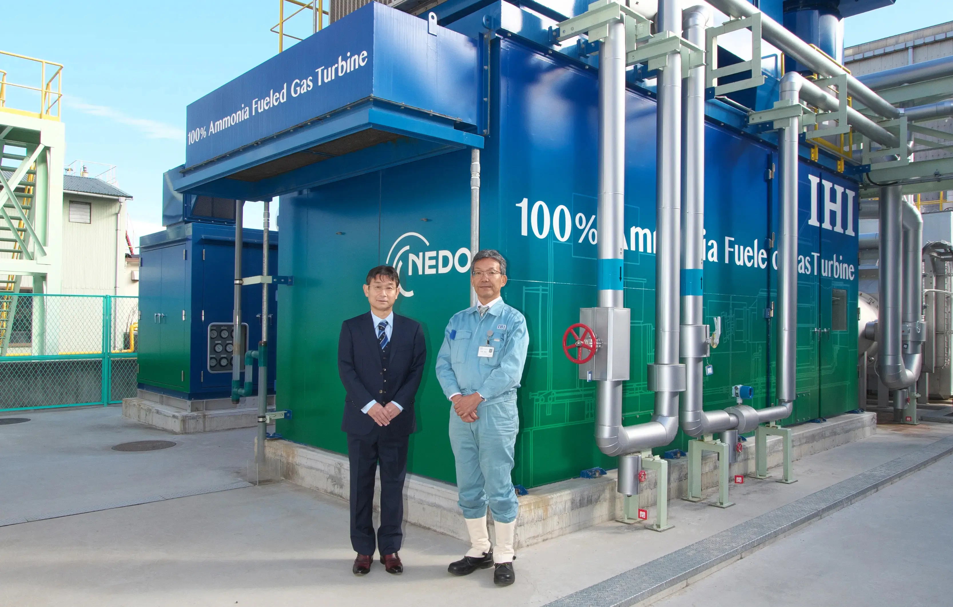 IHI相生事業所のガスタービン施設と、NEDO鮫島康孝プロジェクトマネージャー(サーキュラーエコノミー部アンモニア利用チーム長、左)、IHI理事アンモニアガスタービン開発部長の守屋信彦氏(右)