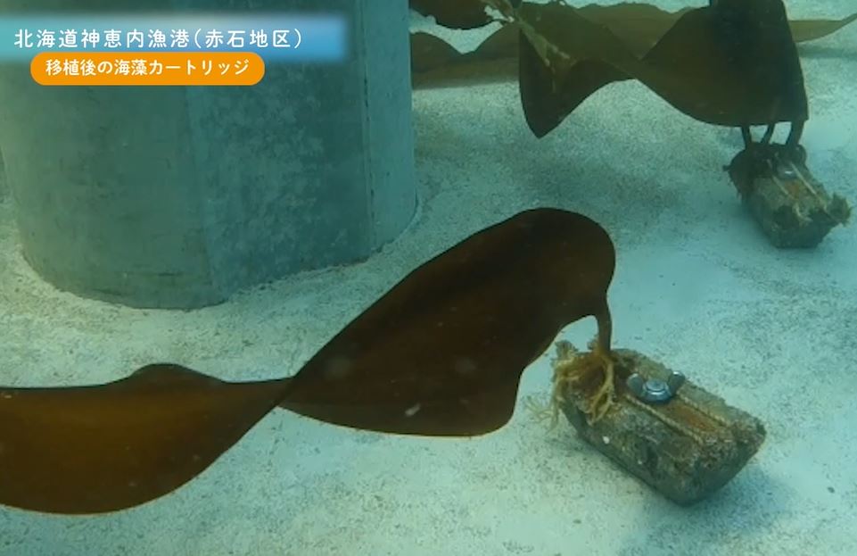 ボルトとナットで藻礁ブロックに取り付けた海藻カートリッジ(出典:KAISO BANKの説明動画から)“藻礁ブロック”については、柱状や板状、プレート状など現場条件に応じて最適な形状が開発されています。「柱状の利点は、ウニなどの海藻を食べる生物が上ってくるのに時間がかかるため、上部の方はその間に海藻が成長できることです。上部の海藻が残っていれば、そこから種が出て新しい海藻が育つという循環ができます」(安藤氏)と、説明します。