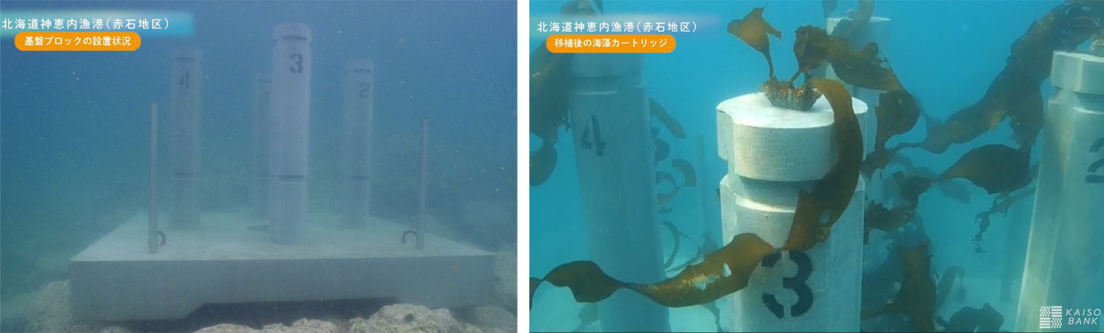 柱状の藻礁ブロックを取り付けた基盤ブロック(左)と藻礁ブロックに海藻カートリッジを取り付けた状態(右)(出典:KAISO BANKの説明動画から)