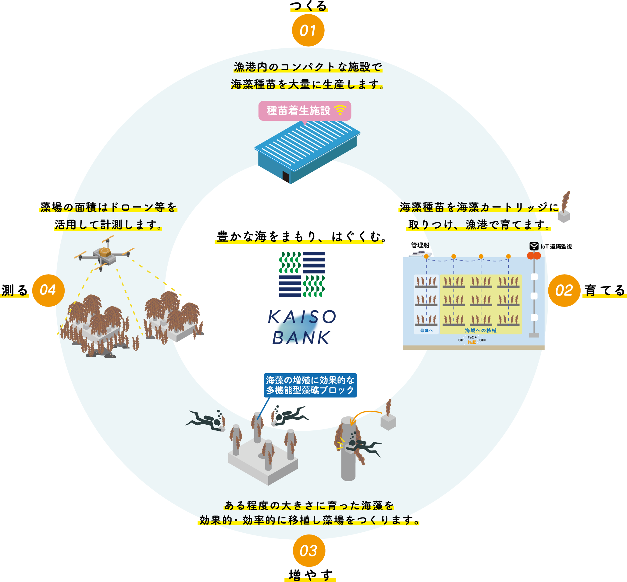 実証実験は「つくる、育てる、増やす、測る」の4段階で進められています。まず、「つくる」という段階では、海洋域から採取した優良な海藻(母藻)を基にして漁港内の施設で種苗を大量に生産します。その後、「育てる」という段階で種苗を専用の“海藻カートリッジ”に取り付けて1~2カ月かけて漁港で育成します。これを中間育成と呼び、ウニやアイゴなど海藻を餌にする魚介類に食べられない大きさにまで育てます。ある程度の大きさに育ったら、海藻の増殖に効果的な機能を備えた“藻礁ブロック”に移植して藻場を作り「増やす」のです。その結果、増えた藻場の面積をドローン等で「測る」ことでCO2吸収量を計算します。