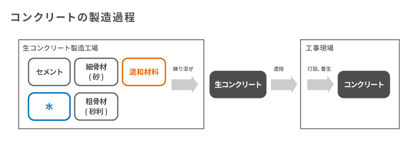 コンクリートは、骨材(砂利、砂等)とセメント、水を練り混ぜて作ります。これに加えて、打設作業のしやすさや硬化後の耐久性向上等コンクリートの性質を改善する混和材料を使用します。混和材料には薬剤のように少量で使われるもの(混和剤)と、材料の一つとして一定量使われるもの(混和材)があります。コンクリートの製造方法は、①整備されたコンクリート製造設備をもつ工場から柔らかい状態で工事現場まで運び、現場で打設する生コンクリートと、②製造設備が整った工場内で打設し、コンクリート製品として出荷し、工事現場では組立ておよび設置を行うプレキャストコンクリートの2つに大別されます。