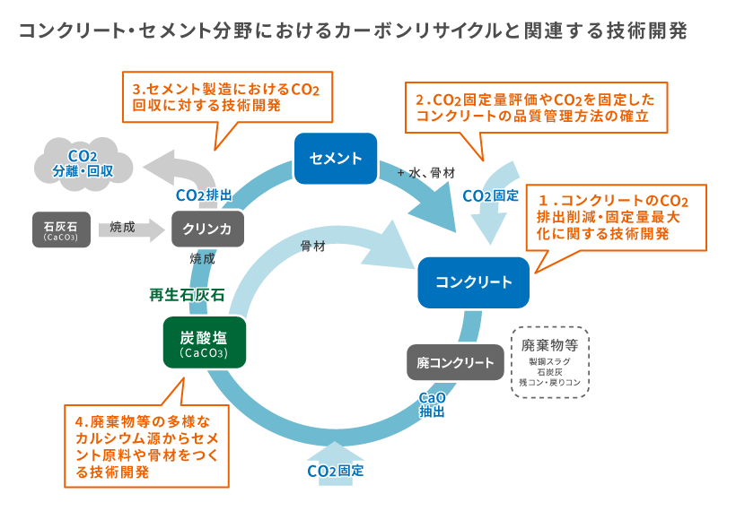 コンクリート・セメント分野において、CO2を最大限活用するため、「コンクリート・セメント分野におけるカーボンリサイクルと関連する技術開発」にある4つの課題に対する技術開発を紹介します。