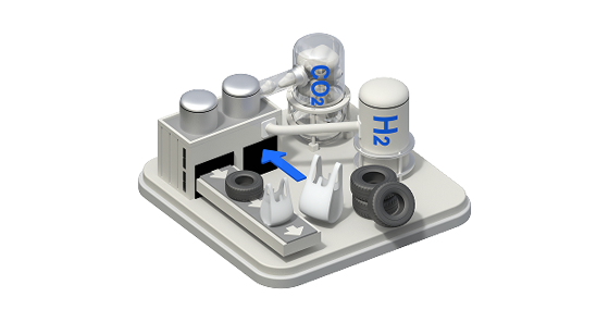 タイヤに使うゴムは、基礎化学品である「ブタジエン」や「イソプレン」を使って作られます。「ブタジエン」は使用済タイヤを熱分解し、リサイクルナフサにしてからまた作ることができます。一方、「イソプレン」は熱分解してから直接作れる可能性があります。この熱分解を使った技術を磨き、使用済タイヤから「ブタジエン」や「イソプレン」へと高効率で生成する方法の研究に取り組んでいます。