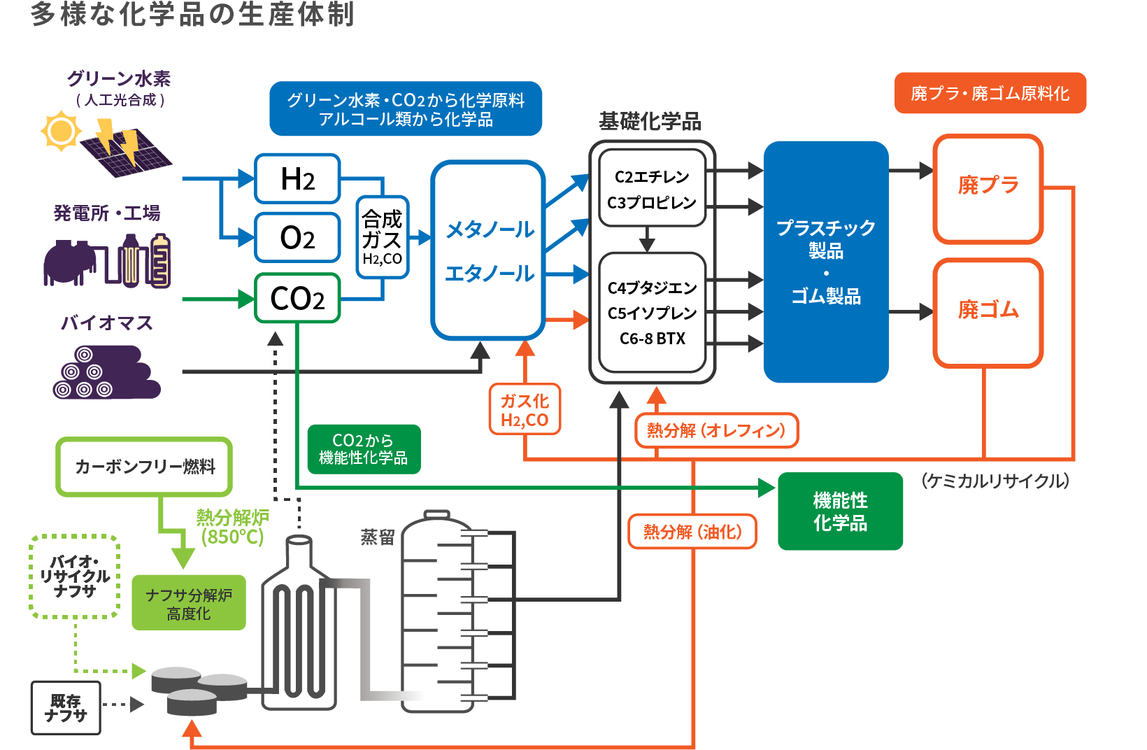 日本の化学産業は、大まかには、石油ナフサから複数種類の基礎化学品をバランス良く生産し、そこから様々な企業が多種多様な化学製品を製造する、という構造にあります。そのため、カーボンニュートラルを進めるにあたっても、引き続き基礎化学品がバランス良く生産できることが重要です。廃プラスチック・廃ゴム、あるいはCO2そのものを原料に幅広い化学品を製造する技術と生産体制の確立を目指しつつ、あわせて、ナフサからの基礎化学品製造に用いる燃料由来のCO2排出を削減する技術開発も進めます。