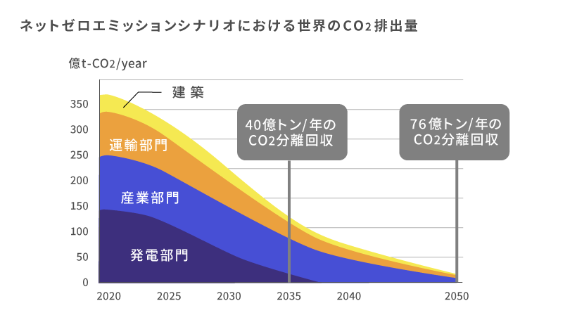 IEA(国際エネルギー機関)のシナリオによると、2050年のCO2ネットゼロ(実質的にCO2排出をゼロにする)を実現するためには、再生可能エネルギーや、水素・アンモニア燃料等を使うことで各産業分野のCO2排出は削減されていく見込みですが、それと並行して、どうしても排出されてしまうCO2への対処としてCO2分離回収が求められます。