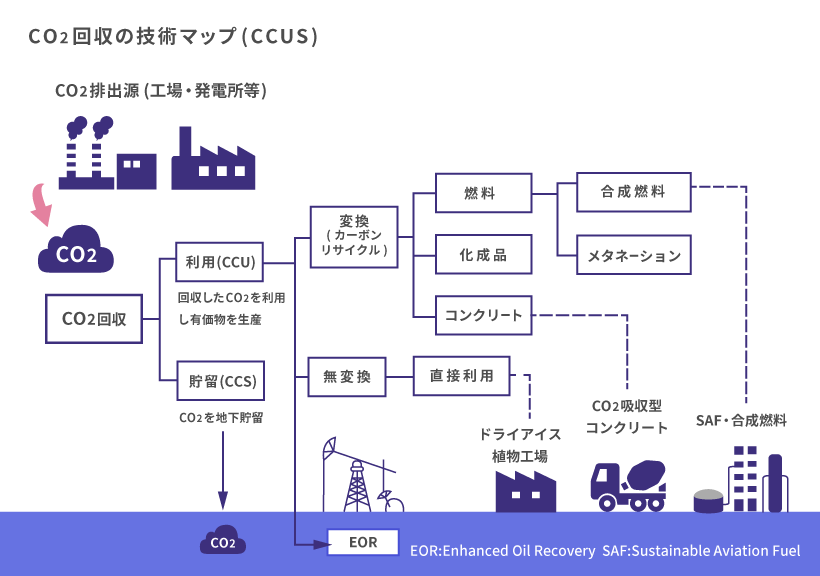 2050年のカーボンニュートラル実現が求められていますが、現時点で社会を支える部素材や電力量を確保するには一定量の化石燃料が必要です。これを燃やすなどの過程で工場や発電所からどうしても排出されてしまうCO2があり、CO2の排出を完全にゼロにするのは現実的ではありません。CO2の排出を削減するために、排出されたCO2を貯留または利用する技術(CCS/CCU)が注目されています。