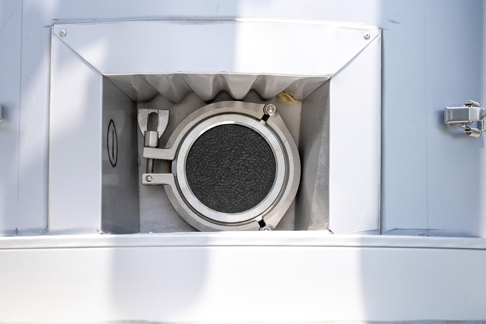 「地球の恵みステーション」で用いる固体吸収材を見たところ。黒色のペレット状になっている。「万博での実証実験は、CO2の回収量0.3TPD(1日あたり300kg)、回収濃度98%以上、および電力消費量としてCO2が1kgあたり0.1kWhという目標の達成度を検証するものです」と寺井センター長が語るように、これらの目標は、実用化に向けた重要な指標となります。万博での実証後、2026年度には、万博で設置したCO2分離回収装置を改造し、より大型化した実証機を用いて、戸田工業の事業所で継続的な実証テストを行う予定です。この継続的な実証を通じて、装置の耐久性や安定性、さらには大規模化における課題を洗い出し、技術を磨き上げていきます。