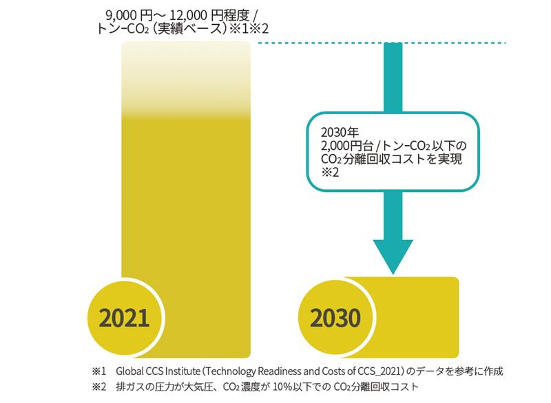 このような国際的な動きに対応するため、日本もCO2分離回収技術の開発を加速させています。「NEDOのGI基金事業では、2030年までにCO2分離回収コストを1トンあたり2000円台に低減するという目標を掲げました。