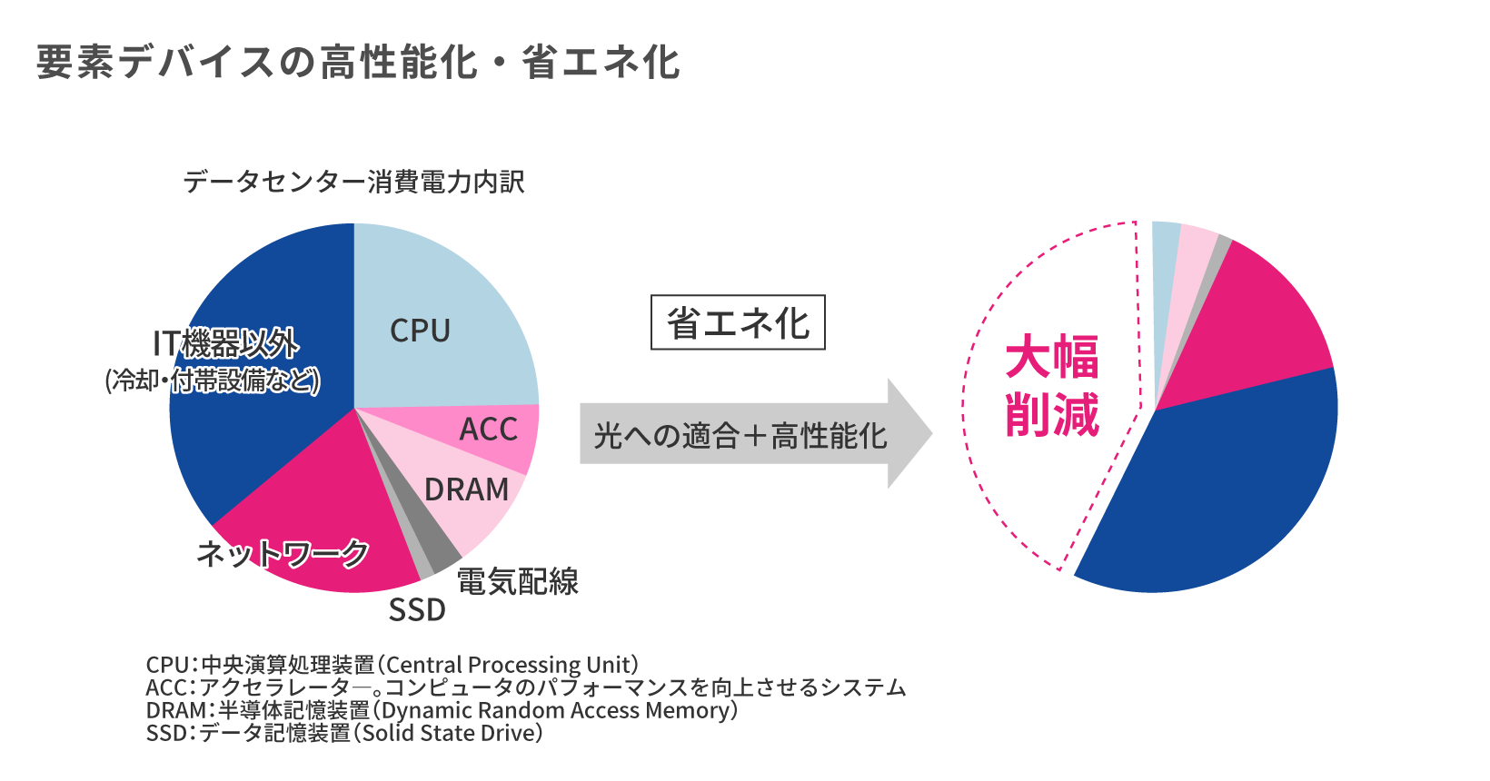 齋藤氏:まず、ネットワークから端末、チップに至るまで光配線化に対応できるデバイス開発の潮流があります。データセンターのサーバを構成する要素デバイス、たとえばCPU(中央演算装置)、DRAM(メインメモリ)、SSD(フラッシュメモリ)等を光接続できるものにしていきます。また、処理性能自体を大幅に高めるために、「アクセラレータ」と呼ばれるAI計算に優れた処理装置(プロセッサ)への対応も考慮していきます。