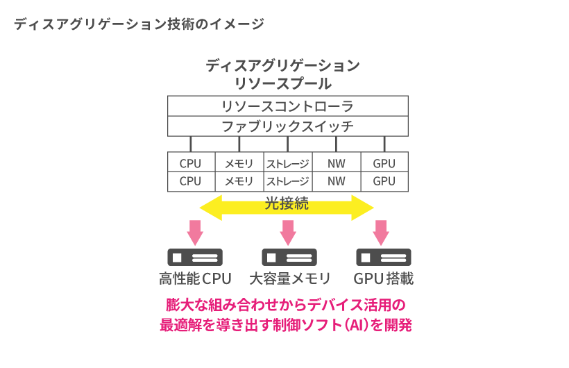 データセンターは数多くのサーバから構成されており、デバイス単位で見ていくと未使⽤状態の部分も発生しています。データセンター全体として未使用デバイスを減らして計算リソースの高効率利用が実現できれば無駄な電力消費を削減できます。そこで、大容量・低遅延で配線距離も延ばせる光配線を使い、より柔軟なデータ処理を、サーバ間やラック間にまたがった各デバイスにも割り当てられるよう取り組んでいます。また、どのような計算負荷に対しても最適な割り当てが実現できるよう、ディスアグリゲーションの制御においてAI技術も活用するなどの工夫も進めています。