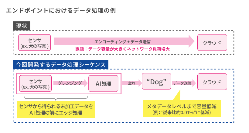 高田 和幸氏(以下、高田氏):今後、社会全体でDXが推進されるほど処理するデータ量は多くなるため、データの効率的な処理と消費電力の抑制を考える必要があります。本プロジェクトで実用化しようとしているのは、データ処理をクラウドに集中させず、エッジ端末で行う「エンドポイントコンピューティング」という考え方です。センシング技術(センサを用いて様々な情報を計測・数値化する技術)で取得したデータを、AIを活用して使いたいデータの形に変換します。従来はこうしたデータの精選や変換等の処理に負荷がかかっていましたが、取得時に処理できれば、その後のデータ通信負荷を大幅に低減させることができます。