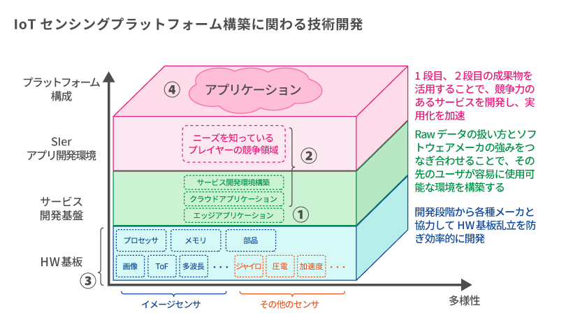 具体的には、4つの取り組みを進めています。1つ目は各センサデバイス側で、低消費電力かつ高精度な信号処理をするための技術開発。2つ目はSIer(システムを統合して運用する情報処理事業者)の開発環境を整え、今回の技術を個別アプリケーション開発等につなげていくための環境整備。3つ目は多種多様なセンサを搭載可能なハードウェア基板技術の開発。4つ目はこれら3つの技術を活用したアプリケーションの開発です。