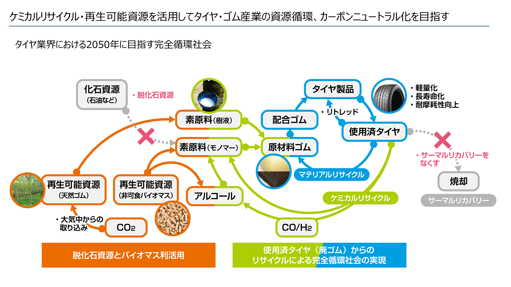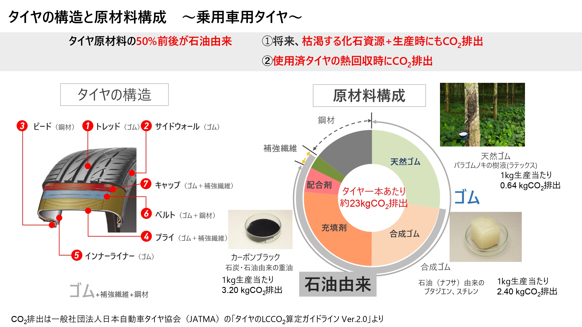 また、使用済タイヤについては、日本では98%(2022年JATMA集計)が再利用されている一方で、現状は完全に元のタイヤに戻すこと(資源循環)は困難で素材として十分利用されず、焼却処理する時に発生する熱を燃料として再利用されることが多いものの、CO2が排出されてしまうという課題があります。