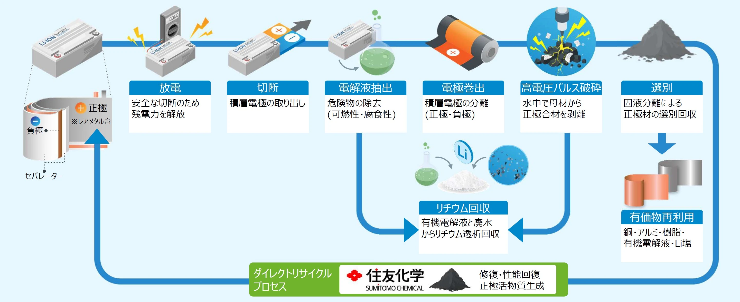 JERAの高電圧パルスを利用したブラックマス回収技術と住友化学のダイレクトリサイクルを組み合わせた循環イメージ(出典:JERA)