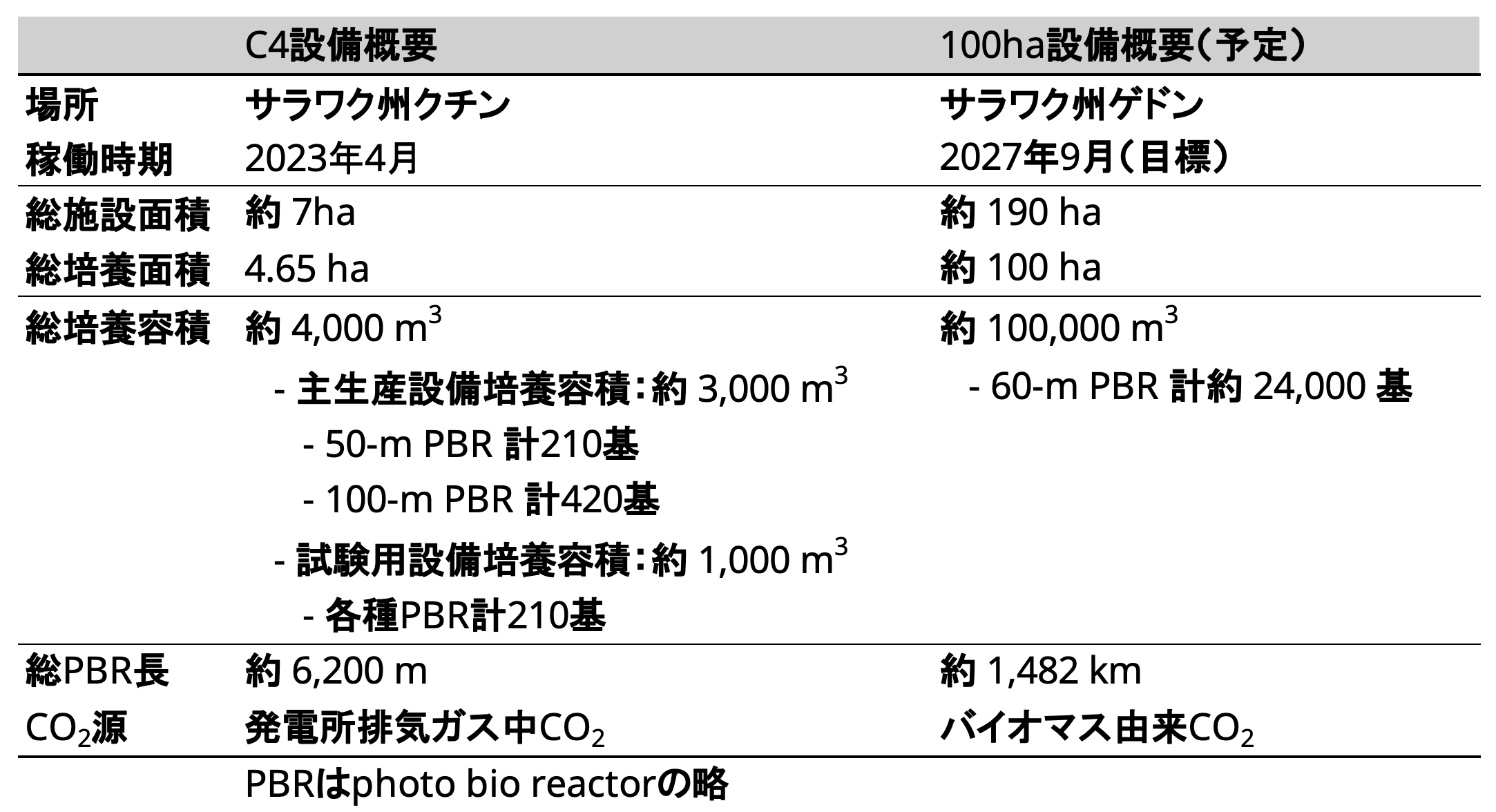 マレーシアでちとせ研究所が取り組む拠点は2か所あります。サラワク州のクチンにある5haの設備「C4(CHITOSE Carbon Capture Central)」と、同州ゲドンにある100haのプラント(名称未定)です。C4における実験では、2年間の長期間にわたって微細藻類の育成設備の可能性が検証され、その成果をゲドンのプラントに反映します。ゲドンのプラントでは地盤改良の前準備(クリアランス)を実施し、「藻類由来バイオマスからのものづくり」の実証が始まります。いずれもGI基金事業の一環です。