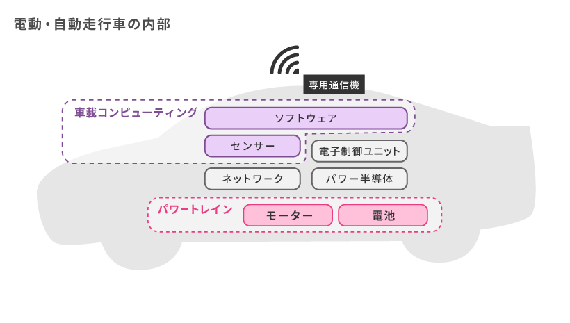 電動化と自動運転を組み合わせた電動・自動走行車を動かす鍵となるのが、駆動させる仕組みであるパワートレインと、自動走行を司る車載コンピューティングです。車は、エネルギーをモーターに伝達し、モーターによる運動エネルギーによって走行するのですが、この機能部分をパワートレインと言います。電動車のエネルギーを蓄えている電池も、パワートレインに含まれます。車載コンピューティングについては別の記事で紹介しており、ここではパワートレインの仕組みについて、もう少し見ていきます。
