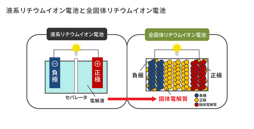 同じリチウムイオン電池の原理をもとに、電解液ではなく固体の電気を通す物質(電解質)を使うのが、全固体リチウムイオン電池というものです。次世代蓄電池の有望な技術の1つとして注目されており、他国でも開発を加速しています。