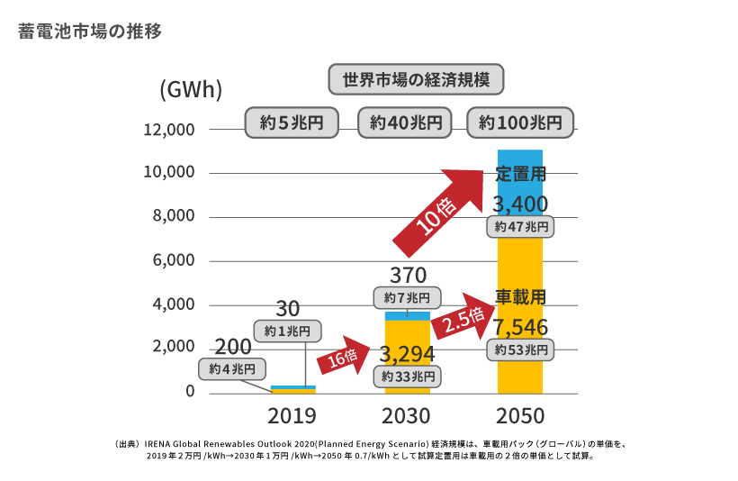 引用元:経済産業省第6回 蓄電池産業戦略検討官民協議会 資料3「蓄電池産業戦略」p7を参考に作成大幅な市場拡大が見込まれる蓄電池・モーター