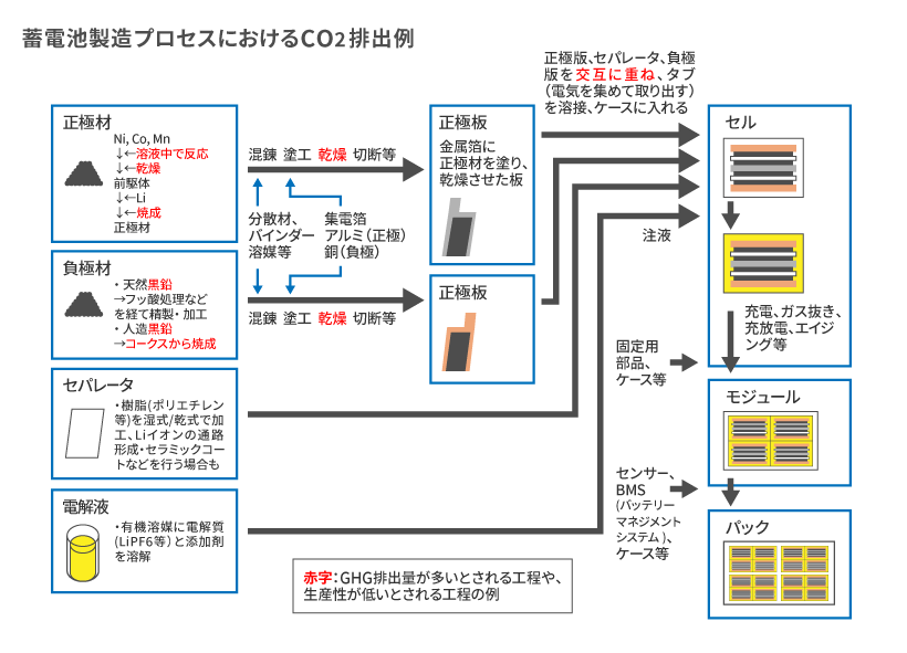 引用元:経済産業省第5回 産業構造審議会 グリーンイノベーションプロジェクト部会 産業構造転換分野ワーキンググループ資料3「『次世代蓄電池・次世代モーターの開発』プロジェクトに関する研究開発・社会実装の方向性」p17を参考に作成なお、高性能蓄電池を量産していくためには、製造時のCO2削減に向けた生産技術の革新も求められます。材料工程、電池セルを作る生産技術の革新をはじめ、全体として製造時CO2排出量を削減することへの対応も工夫していきます。