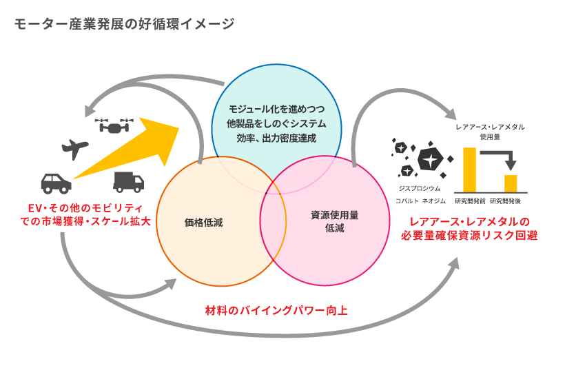 引用元:経済産業省第5回 産業構造審議会 グリーンイノベーションプロジェクト部会 産業構造転換分野ワーキンググループ資料3「『次世代蓄電池・次世代モーターの開発』プロジェクトに関する研究開発・社会実装の方向性」p38を参考に作成モーターシステムについては、小型で軽量かつ高性能な仕組みができれば、広くモビリティ全般に応用できることが期待されています。今回は、こうしたモビリティ向けモーターシステムの高度化に向けても取り組んでいます。