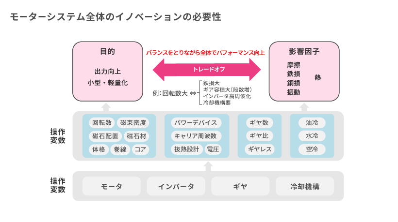ただし、モーターの仕組み上、一箇所だけ性能向上をさせても、他の部分で背反する事象が起こることがあります。モーターを小型化して高回転化を進めても、回転させる力(トルク)が小さくなるため、ギアによってトルクを増幅させる必要があります。このとき歯車として回るギアが摩擦を起こすのですが、負荷が増えるほど、ギアの摩擦によるエネルギー損失も増えることになります。また、モーターの材料として利用する磁石は、熱を帯びるほど性能が落ちてしまいます。他方で、熱を押さえようと冷却機構を組み込むと、大型化・重量化に繋がります。いかにモーターやギア、インバーター、冷却機構間のバランスを取るかに難しさがあり、そこを克服することでシステム全体としての高性能化ならびに小型化・軽量化の実現を目指しています。
