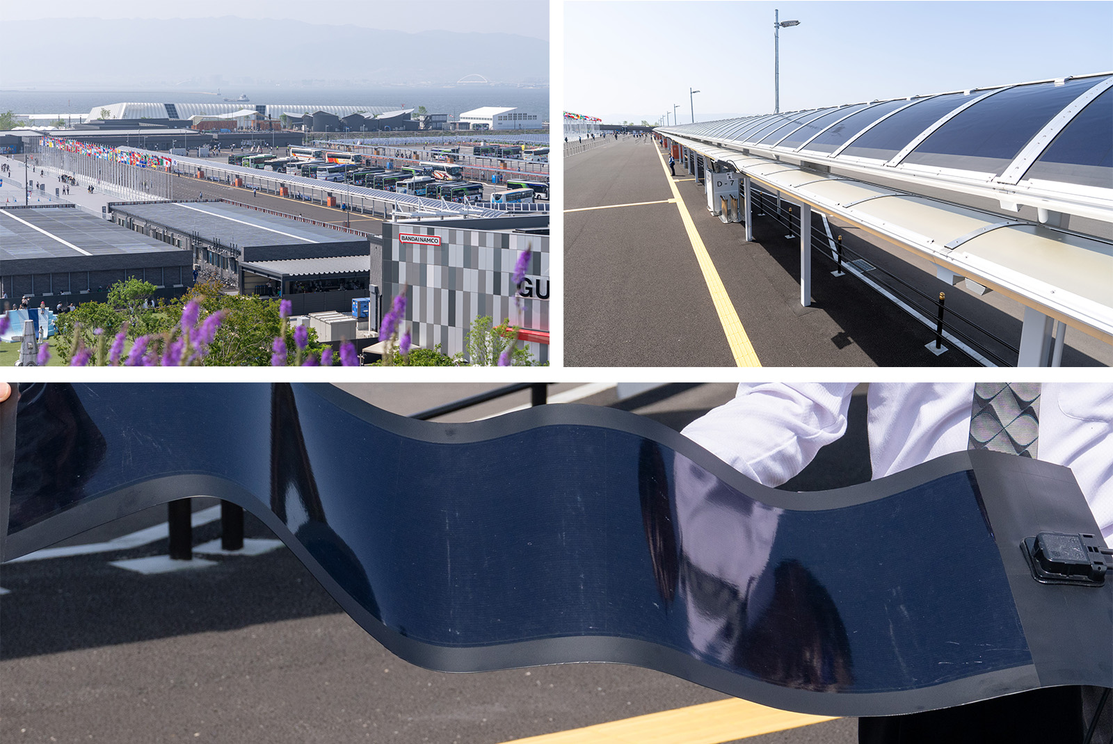 大阪・関西万博の西ゲート・バスターミナルの屋根に設置されているフィルム型ペロブスカイト太陽電池左上:大屋根リングから撮影した長さ250mの設備の全容