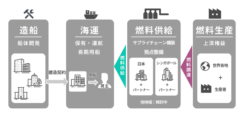 また、商業運航の実現には舶用アンモニア燃料の調達、港湾での貯蔵、燃料供給を行う拠点整備が必要です。そこで、船舶の開発と同時にサプライチェーンや拠点整備、そして生産・調達体制の整備を進めているところです。