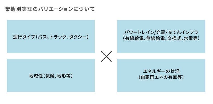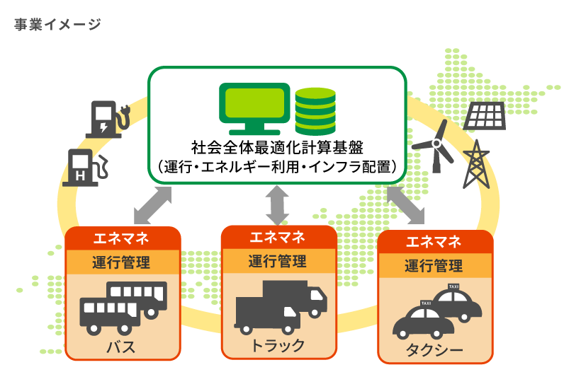 引用元:国立研究開発法人新エネルギー・産業技術総合開発機構(NEDO)「グリーンイノベーション基金事業/スマートモビリティ社会の構築」に係る実施体制の決定について 別紙3p1を参考に作成個別事業者の取り組みをもとに業態別の最適化を実証