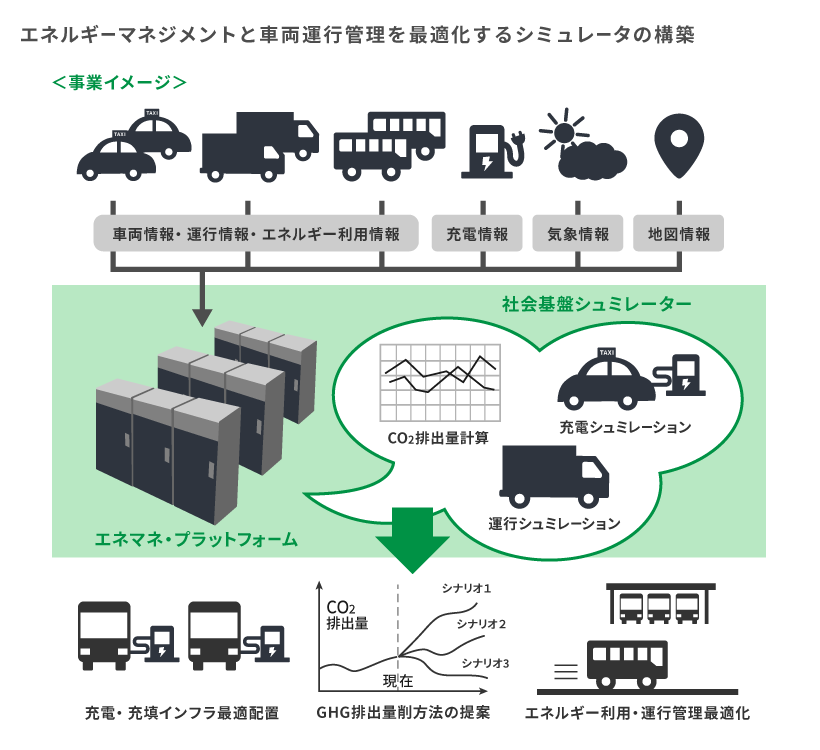 内海氏:個別事業者の運行データやエネルギー利用情報に加え、気象情報や地図情報等のビッグデータを集約し、そのデータを元に機械学習を行い、社会基盤シミュレータを構築していこうとしています。シミュレーション上では個別事業者単独では難しい、より広範囲の充電・充てんインフラの最適配置検討に加え、CO2排出量削減方法の提案や、エネルギー利用・運行管理最適化の提案等もできますので、これを社会全体のためのエネルギーマネジメントのプラットフォームとし、様々な事業者等でも活用してもらうことを想定しています。
