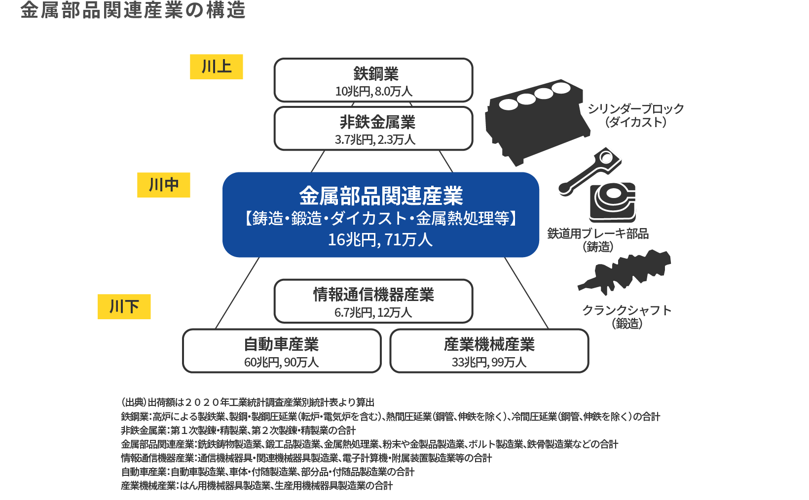 金属部品は、工業炉による熱プロセスを経て製造され、様々な産業に供給されています。特に産業構造の「川中」部分を占める金属部品関連産業においては、自動車、産業機械等の重要部品の製造にあたって、鋳造、鍛造、ダイカスト、金属熱処理、粉末冶金等、工業炉を用いた加熱プロセスが不可欠です。金属部品関連産業の国内総出荷額は16兆円、従業員は71万人にものぼります。