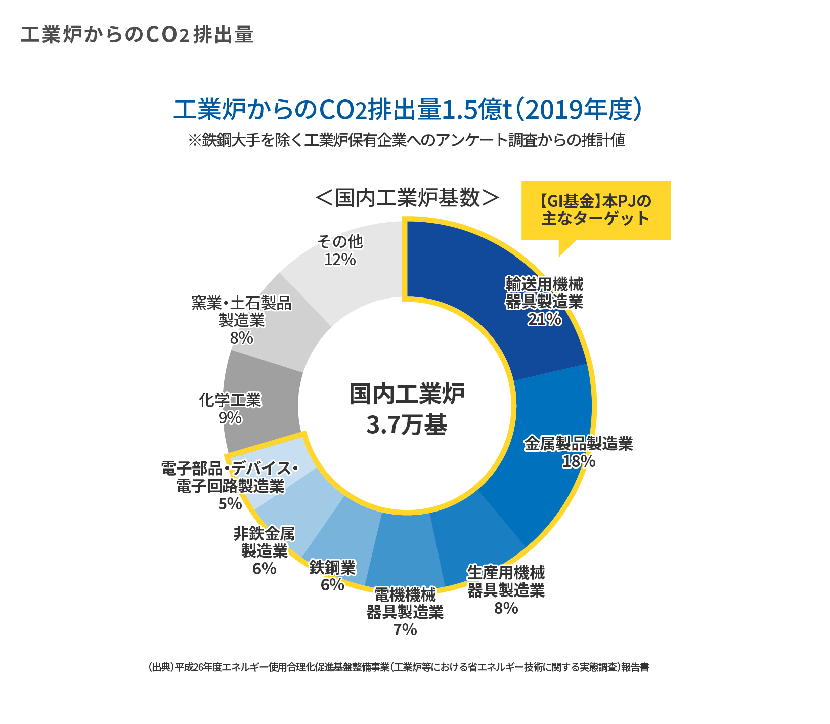 引用元:経済産業省第13回 産業構造審議会 グリーンイノベーションプロジェクト部会 産業構造転換分野ワーキンググループ資料3「『製造分野における熱プロセスの脱炭素化』プロジェクトの研究開発・社会実装の方向性」p5を参考に作成工業炉からのCO2 排出量は1.5億トンあり、我が国の排出量全体の13.5%を占めています。カーボンニュートラルを達成するためには工業炉から排出されるCO2の削減が欠かせません。
