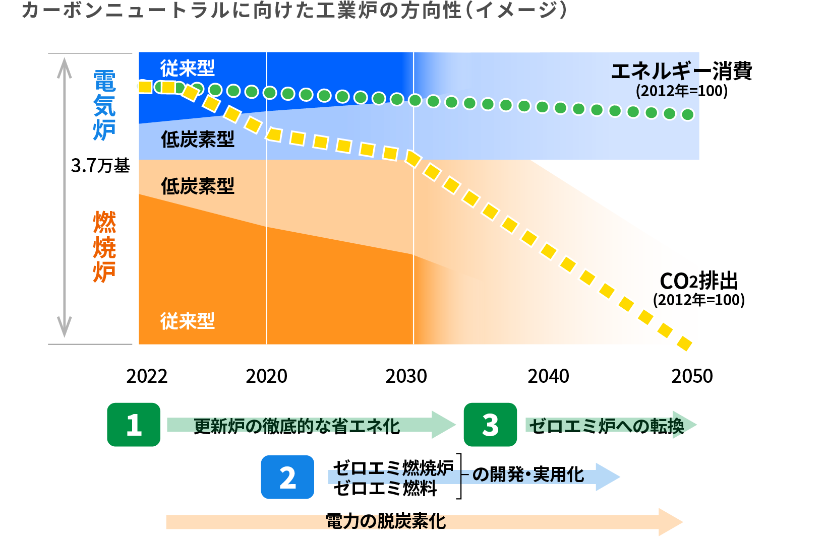 工業炉のカーボンニュートラル化には、用いるエネルギーそのもののカーボンニュートラル化に向けた取り組み状況や調達動向等も見定めながら、複数の技術的アプローチを行っていくことが重要です。