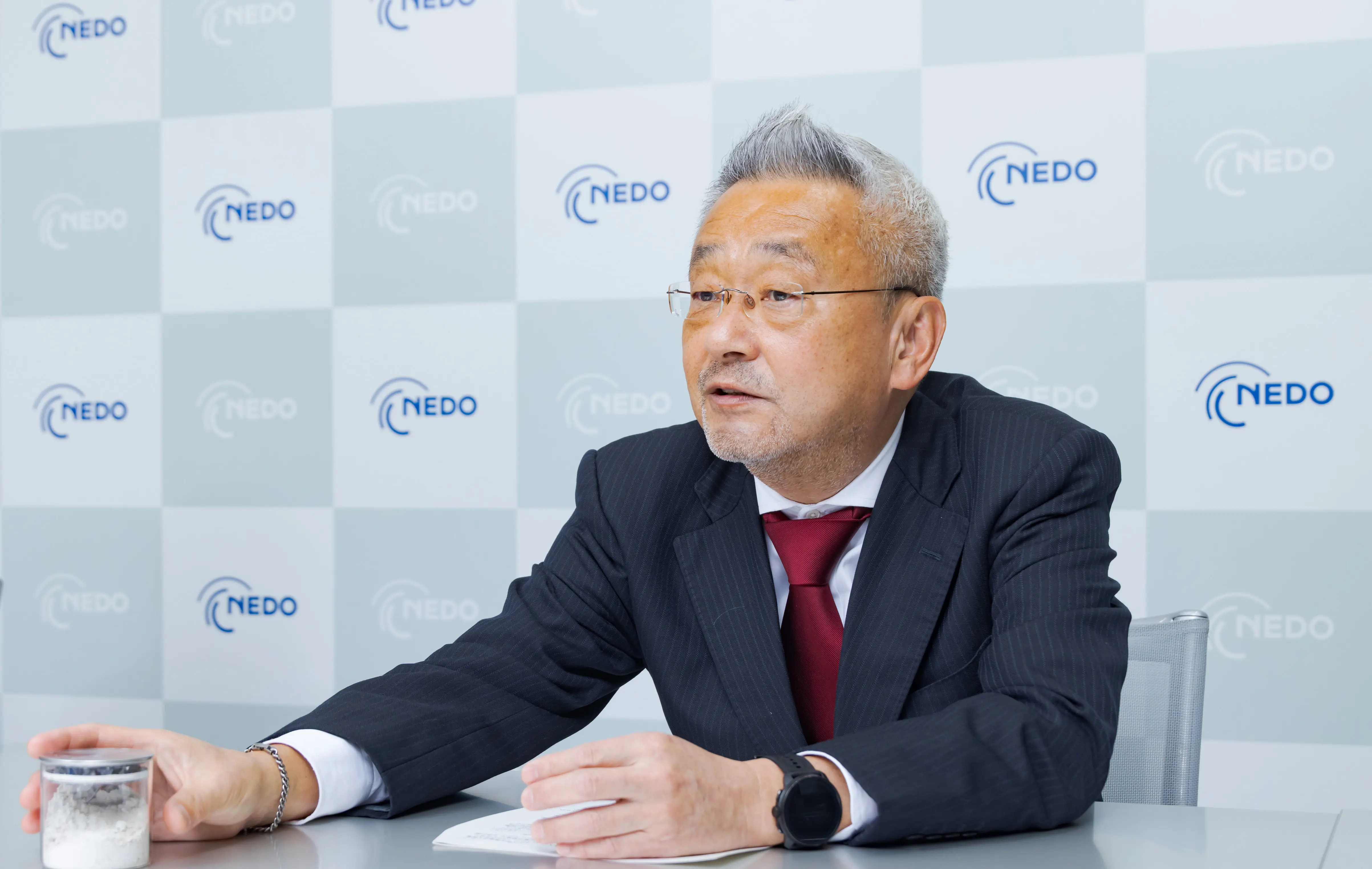 NEDOの川俣孝治プロジェクトマネージャー(サーキュラーエコノミー部カーボンリサイクル鉱物化チーム主査) 手元の瓶は廃石こうボード粉から製造した人工石灰石のサンプル。