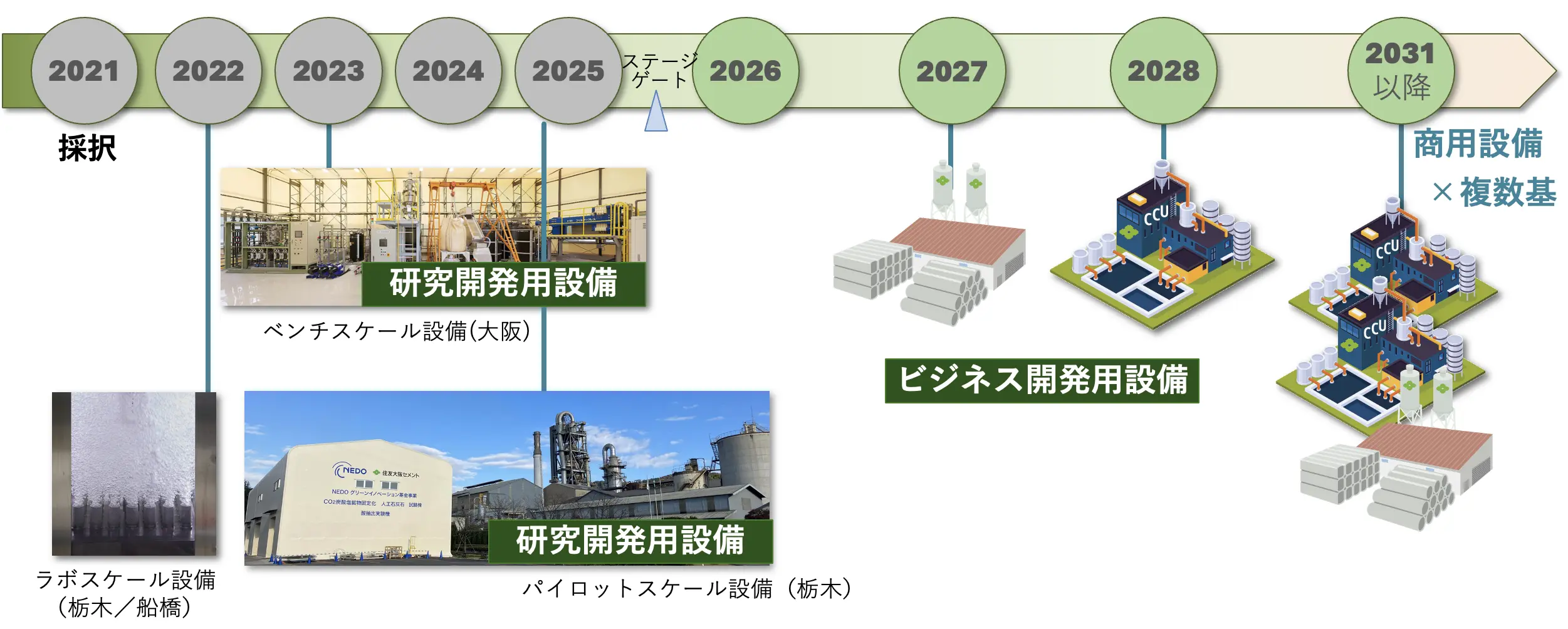 2021年のプロジェクト採択後の事業計画。24年からパイロット設備を運営中 (出典)住友大阪セメント