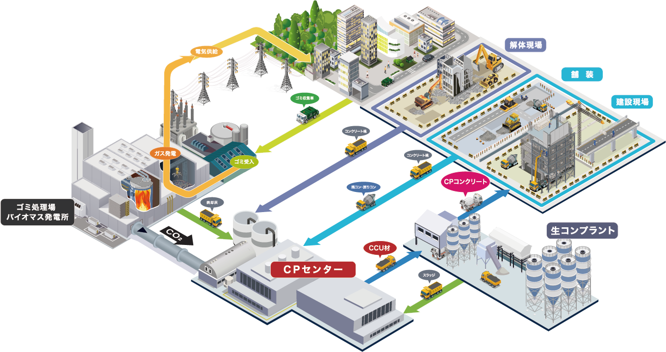 生コン工場からはセメント成分を含んだ排水(スラッジ水)、その排水を圧搾・脱水した板状のスラッジケーキ、さらには生コン車で運んでも使わず工場に戻ってくる「戻りコン」が発生します。一方、建築や土木の解体現場からはコンクリートガラ(解体の際に発生するコンクリートの破片や塊)が出ます。こうした廃棄物を「CPセンター」と呼ぶ施設に集約します。そこでCO2を固定してCCU(CO2回収・利用)材とし、生コン工場に運び、CPコンクリートを作るという考えです。CPセンターで使うCO2は、ごみ焼却場やバイオマス発電所で発生するものを用いる想定です。