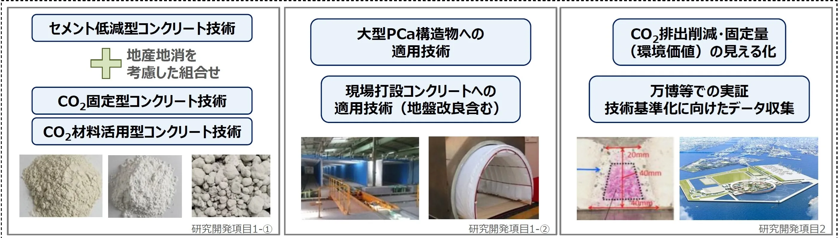 前半で取り上げる「CO2を用いたコンクリート等製造技術開発」プロジェクトは、社会インフラで広く利用されているコンクリートとその主要構成材料であるセメントにおいて、CO2の排出削減・固定量増大とともに、それに伴うコストの削減を図り、利用を促していくことを目指しています。コンクリートでは、「革新的カーボンネガティブコンクリートの材料・施工技術及び品質評価技術の開発」、「CARBON POOLコンクリートの開発と舗装および構造物への実装」、セメントでは「CO2回収型セメント製造プロセスの開発」の各テーマなどが進行しています。