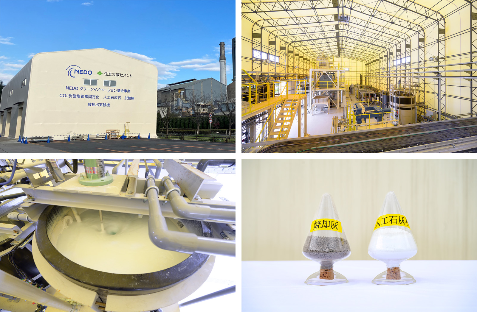 In June 2025, a pilot-scale facility for the production of CO2 recycling artificial limestone was completed at the Sumitomo Osaka Cement Tochigi Plant in Sano City, Tochigi Prefecture. This facility will serve as the central hub for “Development of Carbonation Technology Using Various Calcium”, as part of NEDO’s Green Innovation Fund project to ”Development of Technology for Producing Concrete and Cement Using CO2.”