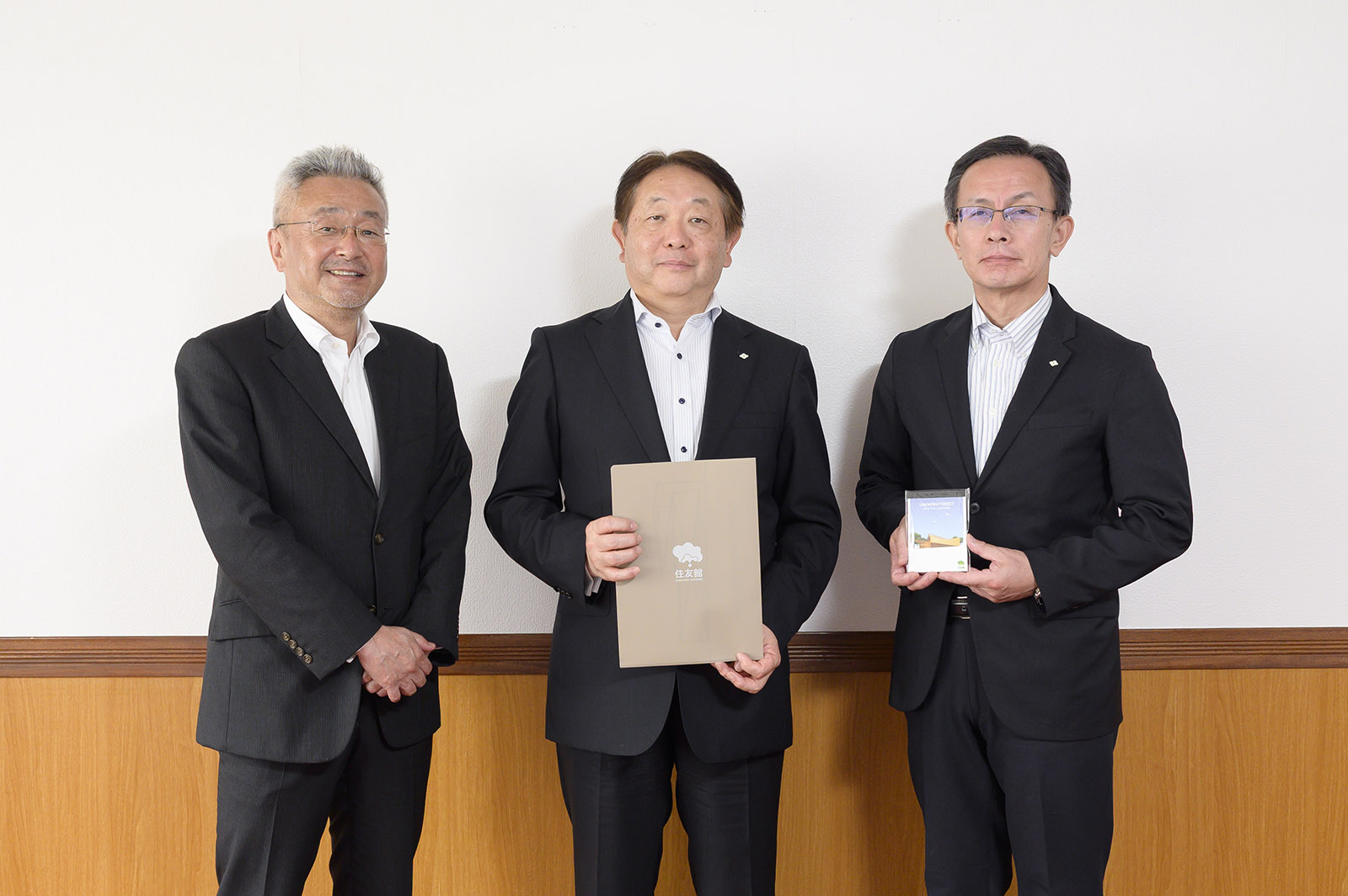 Koji Kawamata of NEDO (left); Noriyuki Kozakai of Sumitomo Osaka Cement with a clear file (center); and Masayoshi Konishi with a memo pad (right)—both made with CO2 recycling artificial limestone.- *Note The CO2 recycling artificial limestone pilot-scale facility occupies a site area of 628.77 m2 and houses equipment for five main process stages: calcium extraction (via acid leaching), water treatment, mineralization, BMED (Bipolar Membrane Electrodialysis), and gas absorption. The CO2 used in the artificial limestone production process is recovered from flue gas emitted by the cement plant located within the same Tochigi Plant site, and is transported to the pilot facility via several hundred meters of pipeline.