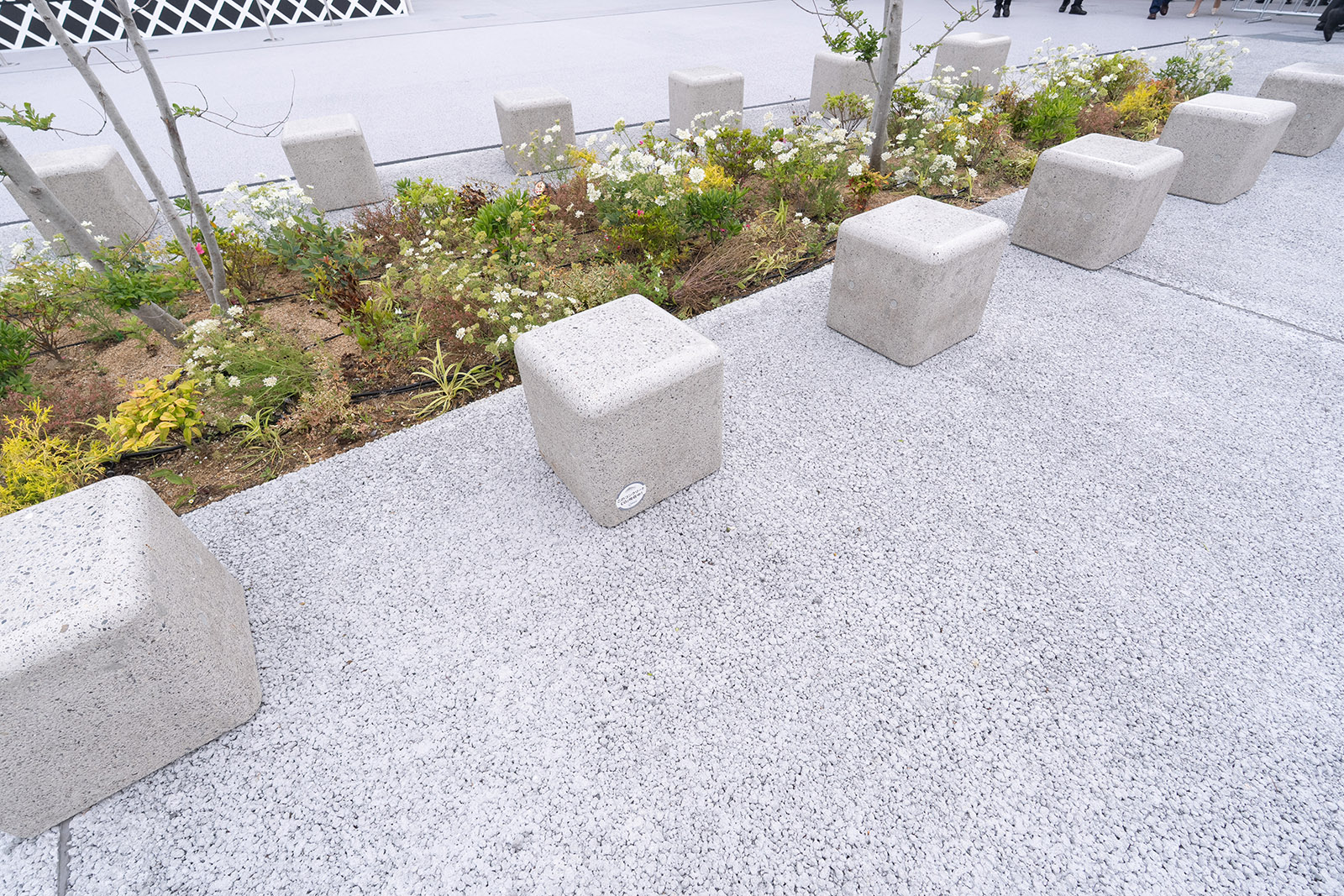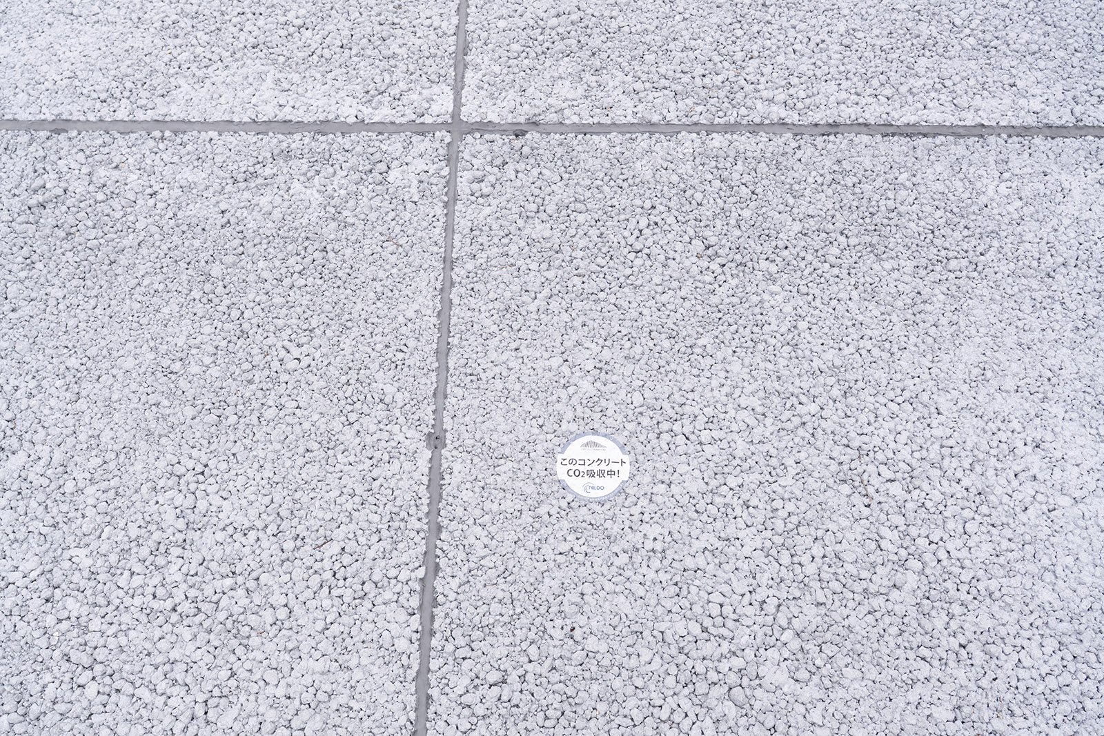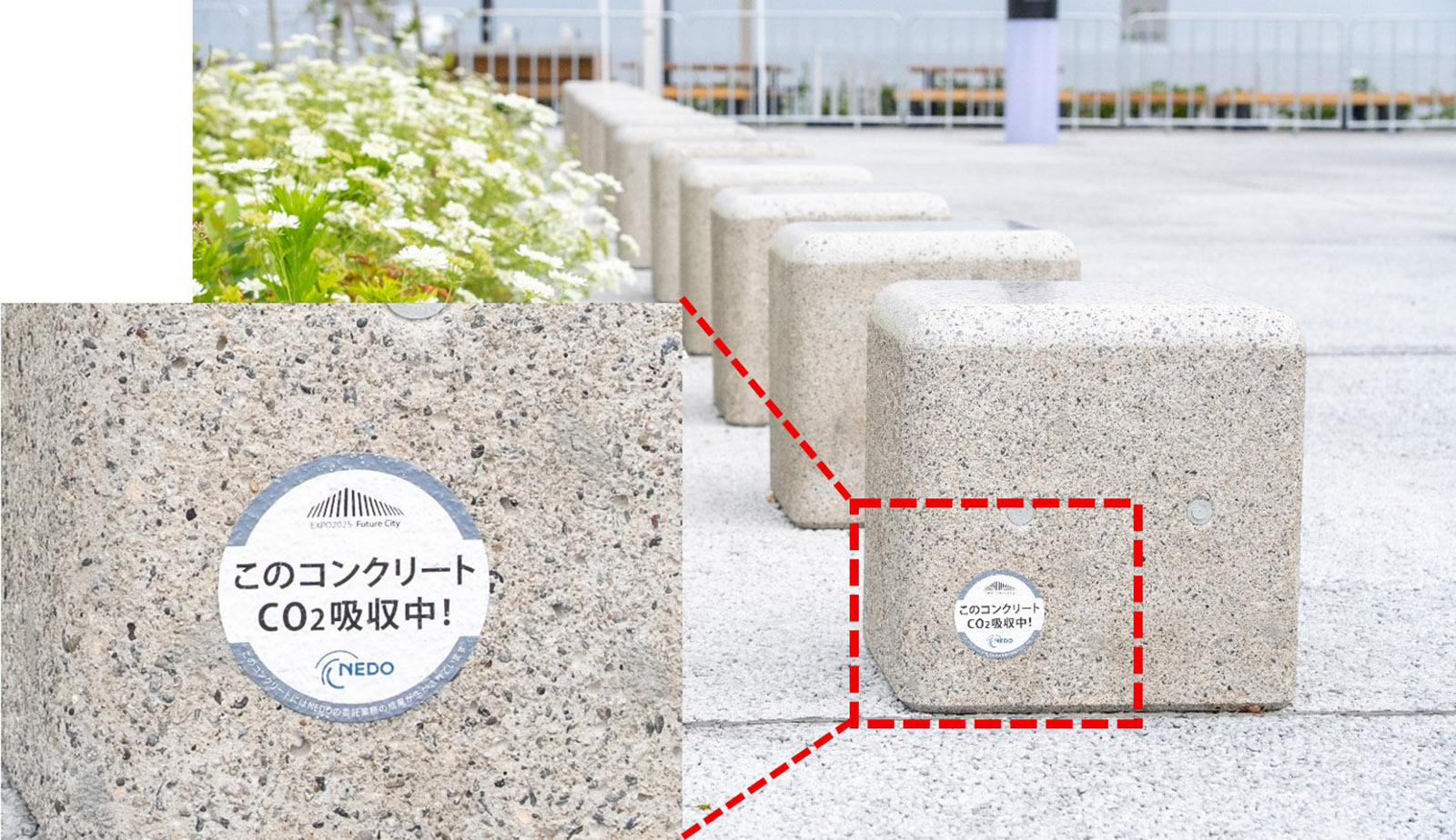 Paving near the entrance of the Future City PavilionTwo types of benches have been installed near the entrance and inside the pavilion. One type incorporates CO2 absorption and fixation in two stages: first during the production of the concrete materials, and then again when those CO2-fixed materials are used to produce the concrete for the benches. The other type involves CO2 absorption and fixation only during the material production stage. Both types of CP Concrete benches continue to absorb CO2 from the atmosphere even while on display, each bearing a sticker that reads ”Currently Absorbing CO2!” After the Expo concludes, the final amount of CO2 absorbed and fixed will be measured.