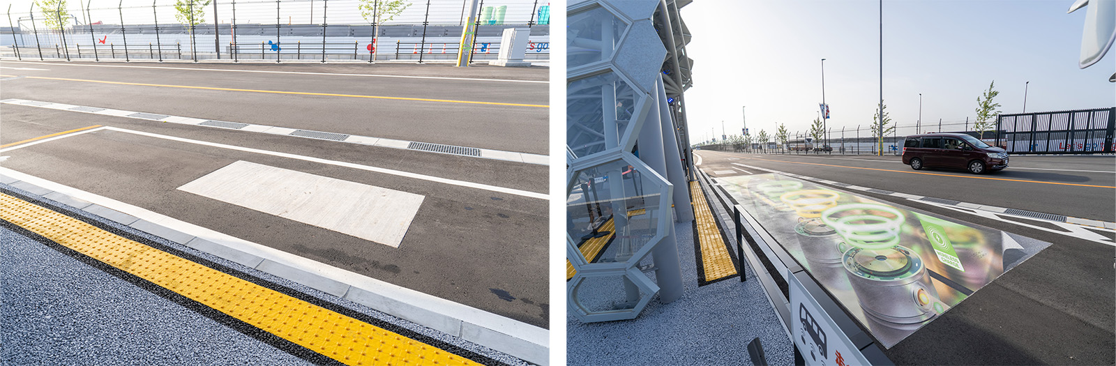 Left: Precast coils embedded in the roadway Right: Illustration raising awareness of wireless chargingAt the Expo, a comprehensive energy management system is being demonstrated for the entire fleet of about 30 eMover buses, including six equipped for wireless charging. The system not only manages charging but also plans charging cycles based on vehicle operating schedules. By integrating energy management with fleet operations, the system aims to curb potential spikes in peak electricity demand and achieve more balanced power consumption as EV buses become more widespread in the future. After the Expo, durability tests of the embedded transmission units, evaluations of usability and construction challenges, and further refinements of the energy management system will be conducted, with the goal of on-road pilot projects in 2028.