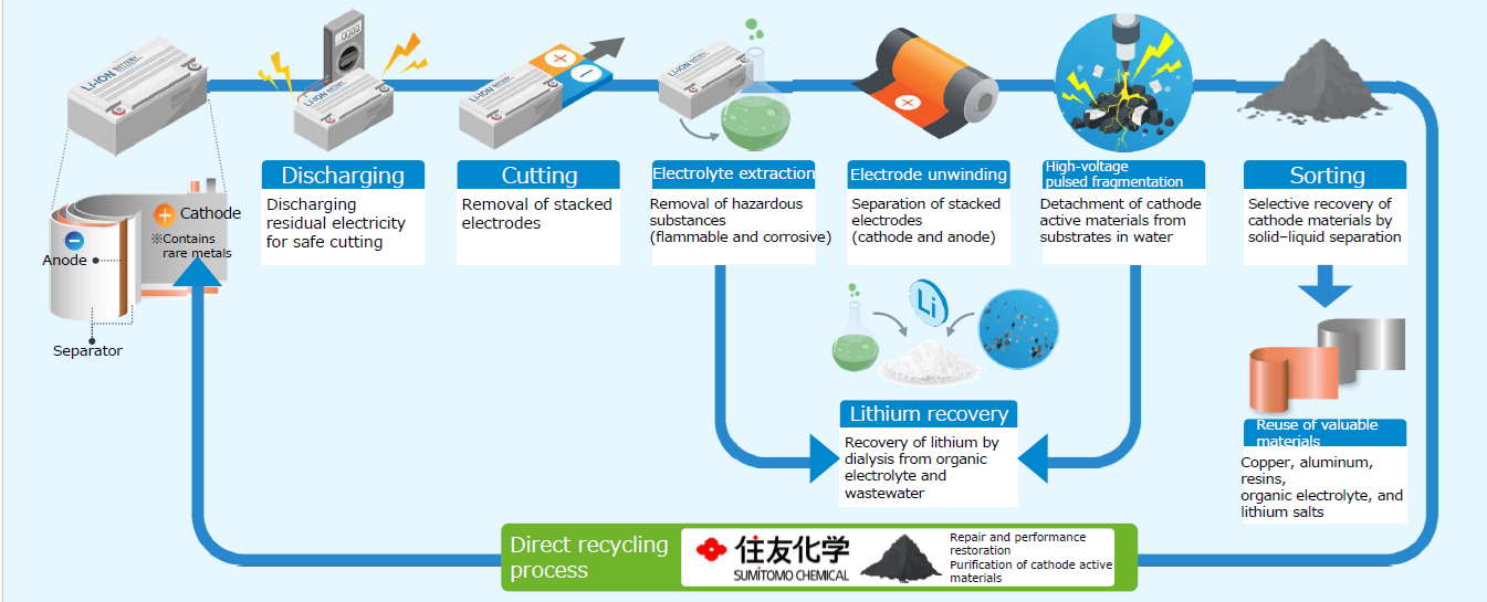 Conceptual circular model combining JERA’s high-voltage pulsed discharge technology for black mass recovery with Sumitomo Chemical’s direct recycling process (Source: JERA)