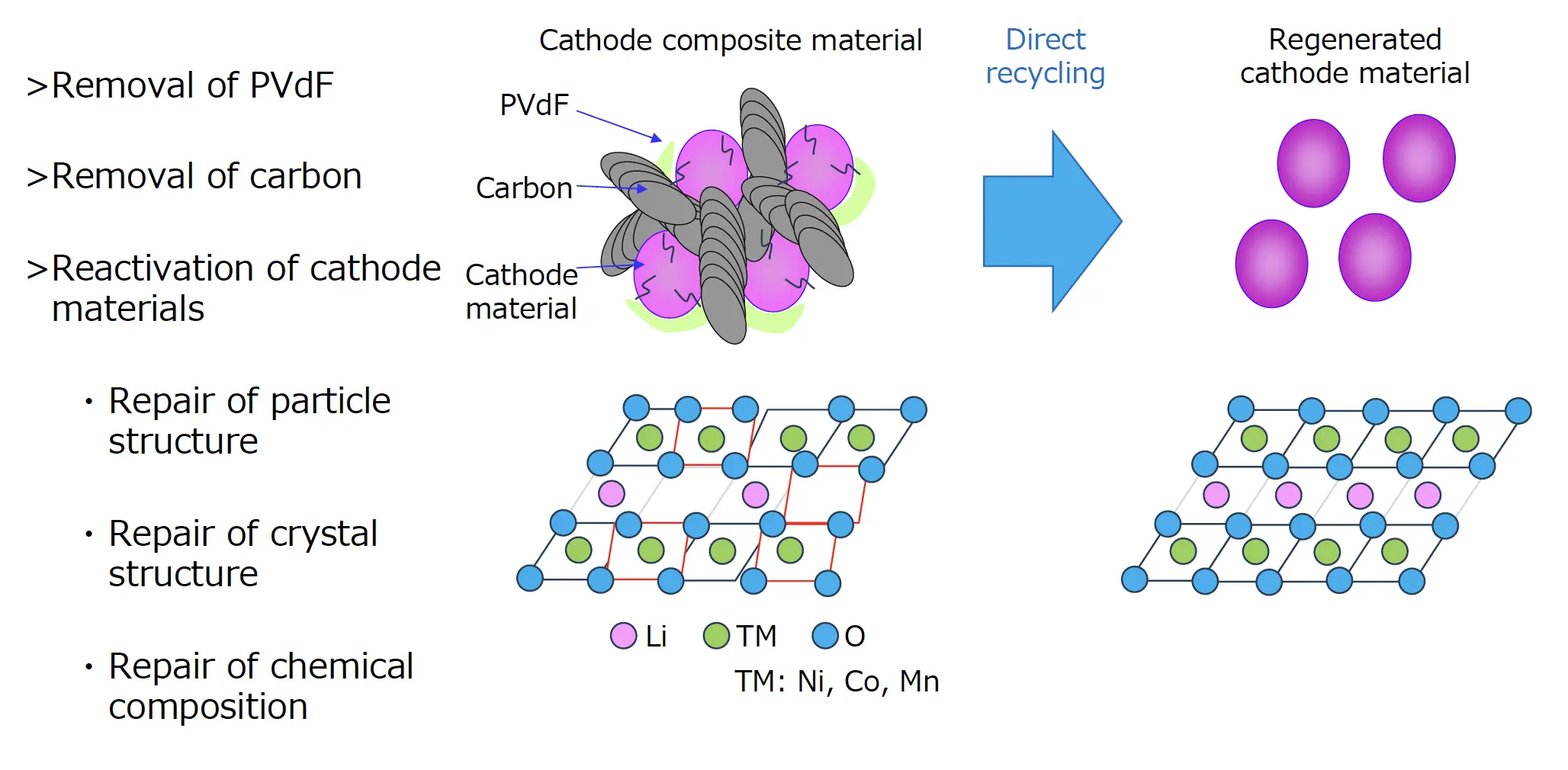 While direct recycling, like the hydrometallurgical and pyrometallurgical processes being pursued by JX Metals Circular Solutions, also utilizes black mass, it differs fundamentally in that it does not extract metal feedstock after recycling. Instead, the recovered materials are regenerated and reused directly as cathode materials.