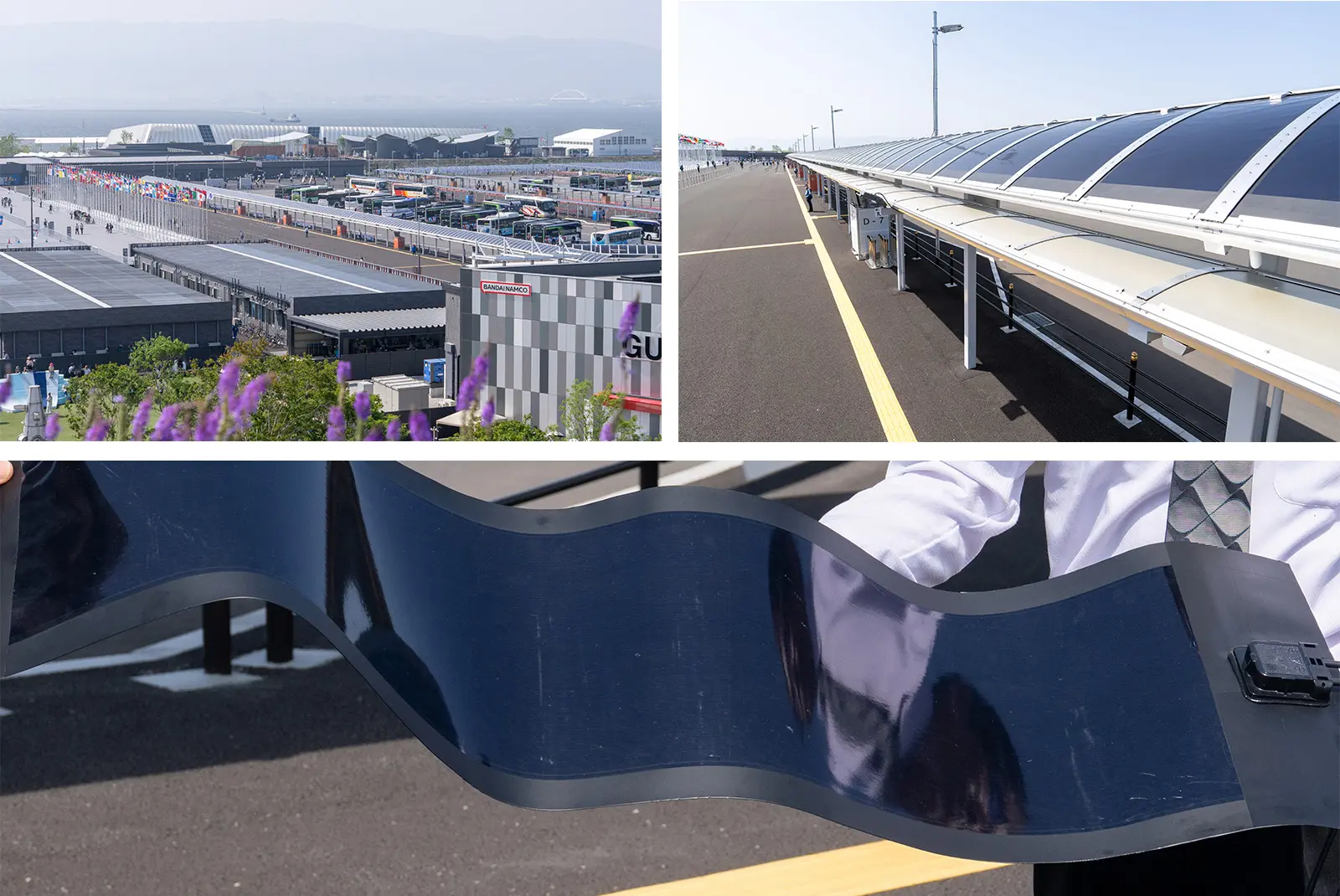 Film-type perovskite solar cells installed on the roof of the West Gate Bus Terminal at Expo 2025 Osaka, KansaiTop left: The 250-meter-long installation viewed from the Grand Roof Ring