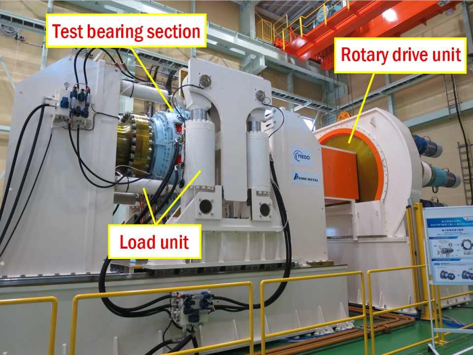 Through its Green Innovation (GI) Fund Projects, “Cost Reductions for Offshore Wind Power Generation,” NEDO is supporting efforts to advance bearing technology. As part of the project, Daido Metal Co., Ltd. has developed a groundbreaking bench test rig for plain bearings used in turbine main shafts. The rig was installed at Daido Metal Saga’s facility in Takeo City, Saga Prefecture, and began operation at the end of April 2025.