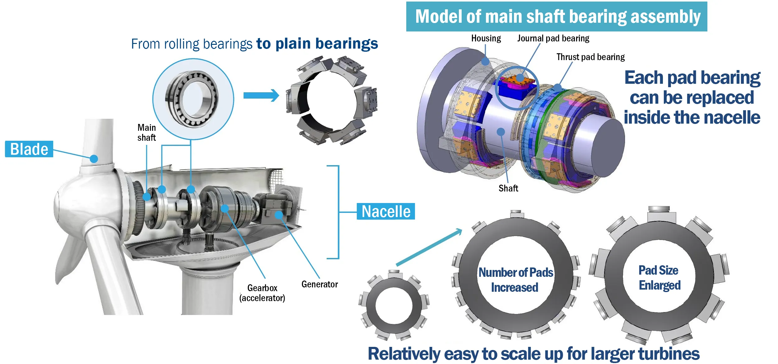 Advantages of Plain Pad Bearings (Source: Daido Metal Co., Ltd.)The main advantages of the plain bearings proposed by Daido Metal Co., Ltd. are their ease of maintenance and the relative simplicity of manufacturing them for larger turbines. Because they are of a split type, the components can be slid out and replaced inside the nacelle. As mentioned earlier, this eliminates the need for large offshore cranes and extensive dismantling and reinstallation work, greatly improving maintenance efficiency.
