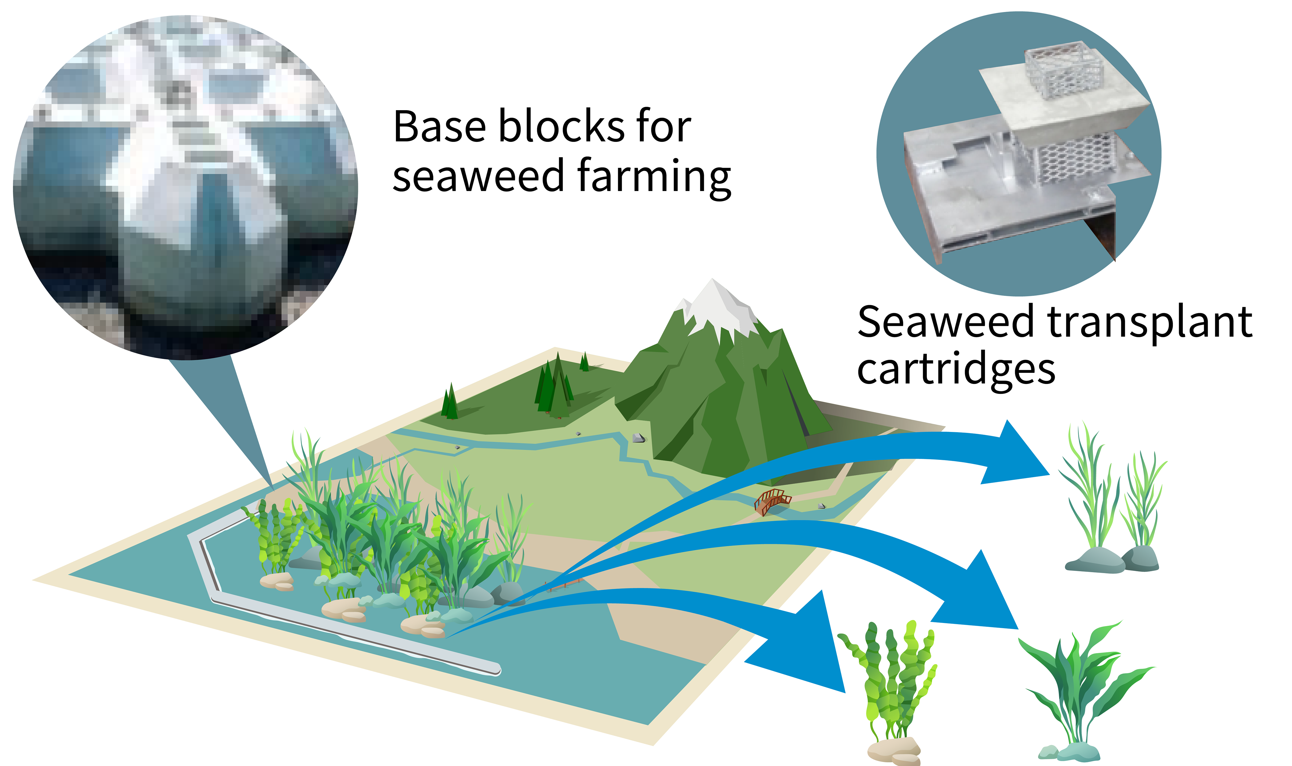 For the construction of large-scale seaweed farming systems, this project aims to develop base blocks that dissolve nutrient salts and possess a strength of 10-18 N/mm2 (the same range of strength demonstrated by conventional blocks), and seaweed transplant cartridges that weigh around 5 kg (approximately one-quarter the weight of conventional cartridges).