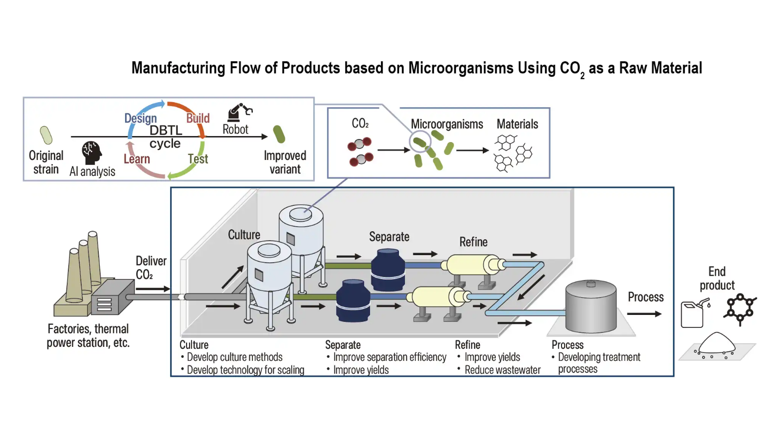 Through supporting the development of microorganism modification platform technologies integrating bio base technologies, digital technologies such as IT and AI, and automation technologies such as robotics, the project aims to speed up the design, build, test, learn (DBTL) cycle with a view to expanding the range of useful microorganisms capable of efficiently absorbing and fixating CO2 used for producing materials, and reducing the time and costs incurred in the modification process.